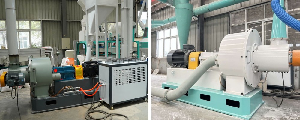該磨粉機由冰水空氣壓縮機、勻料器、合金翻刀盤、雙層研磨室、粉度葉輪、智能粉體加濕器、智能自動加油機、軸承室、風(fēng)機、脈沖、沙克龍、關(guān)風(fēng)器、集成電控系統(tǒng)等組成。